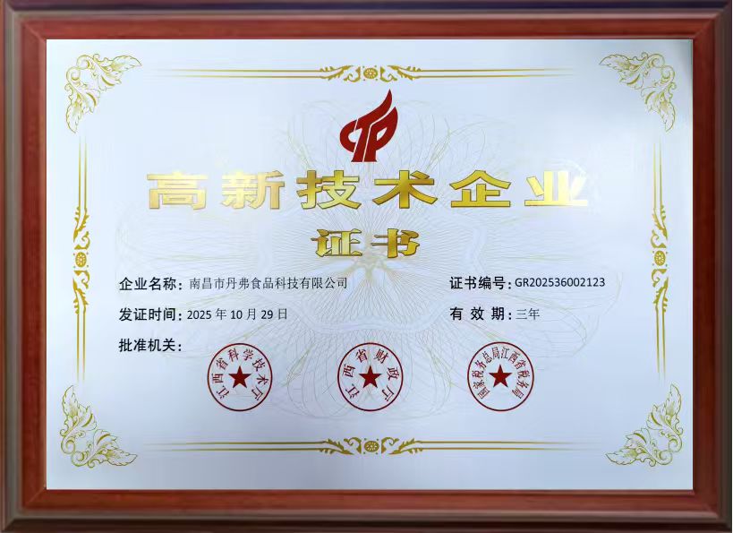 近日,丹弗食品正式通过高新技术企业认定,凭借在智能制造、技术研发与品质管控等领域的突出表现,荣获高新技术企业称号。这一殊荣,标志着企业在科技创新与高质量发展道路上迈出坚实一步。